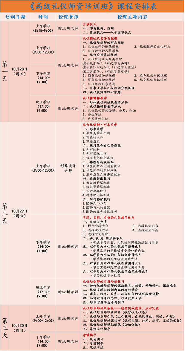 【每天上課時間安排如下】:10月28日(周五)開班儀式:8:45—9:00
